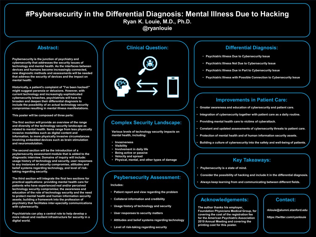“#Psybersecurity in the Differential Diagnosis: Mental Illness Due to Hacking”. Poster Presentation. American Psychiatric Association Annual Meeting 2019. San Francisco, California. May 20, 2019.
